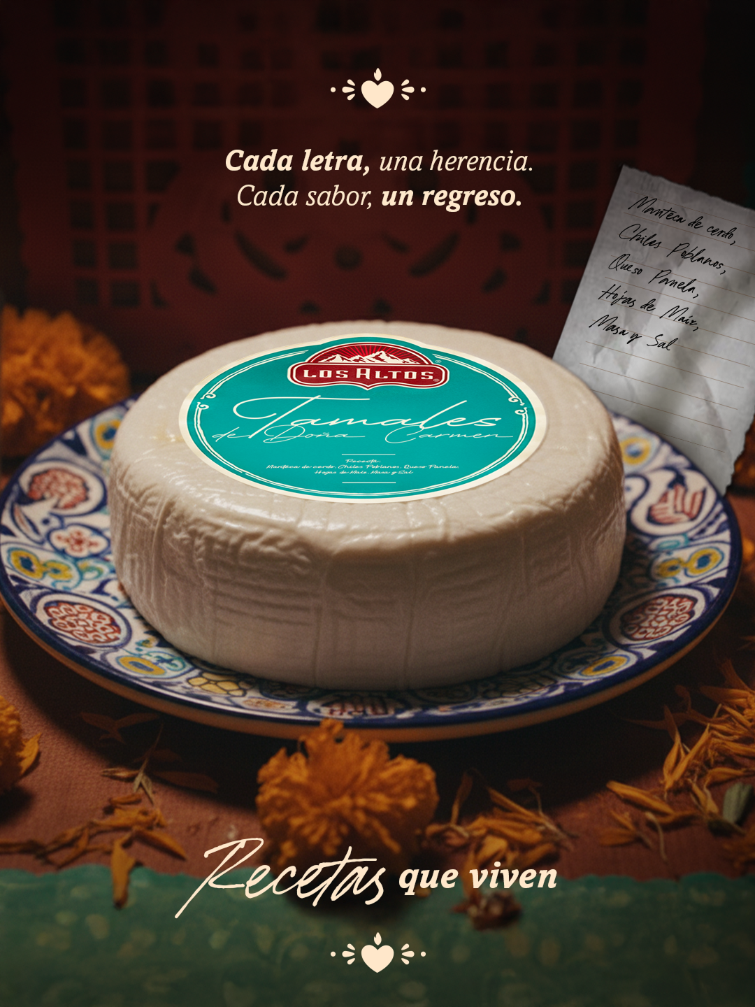 “Living Recipes” is a tribute to those who taught us to cook with love. Those people who are no longer with us, but who continue to return every year in the form of flavor, memory, and tradition. That's why we transformed real recipes from our influencers, written by their grandparents, mothers, or loved ones, into a unique font. A font that brings back the traces of those who taught us not to forget the cheese in our dishes. With it, we redesigned our labels and created a special edition of Los Altos: a product that not only nourishes but also reminds us. A way to give thanks for the legacy they left behind and to keep alive the recipes that unite us.